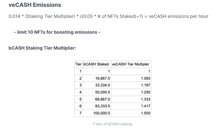veCASH can only be accrued by staking bCASH according to this formula and table: